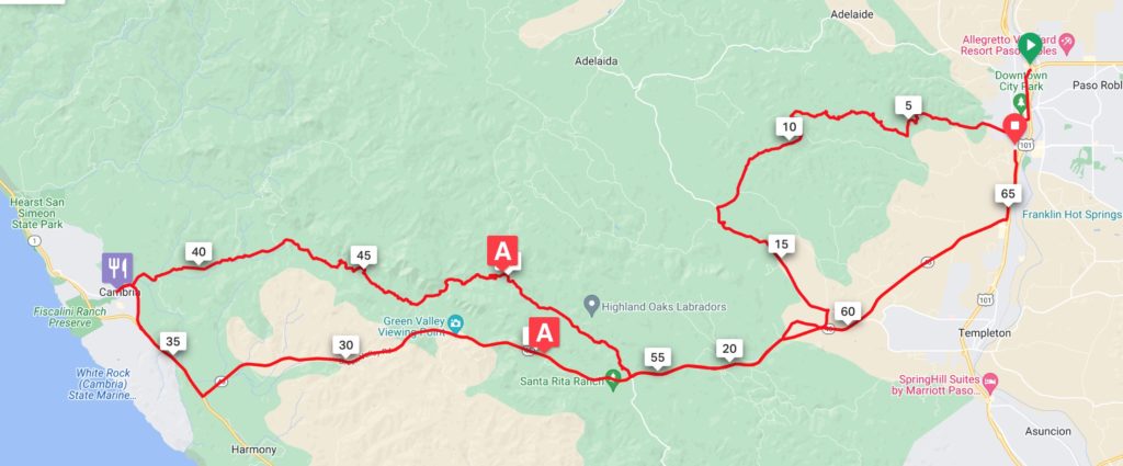 At the top of the Wall, we will meet up with the SAG wagon. From there we will stay on Santa Rosa Creek Road back to Highway 46, turn left there and head straight back to Paso.