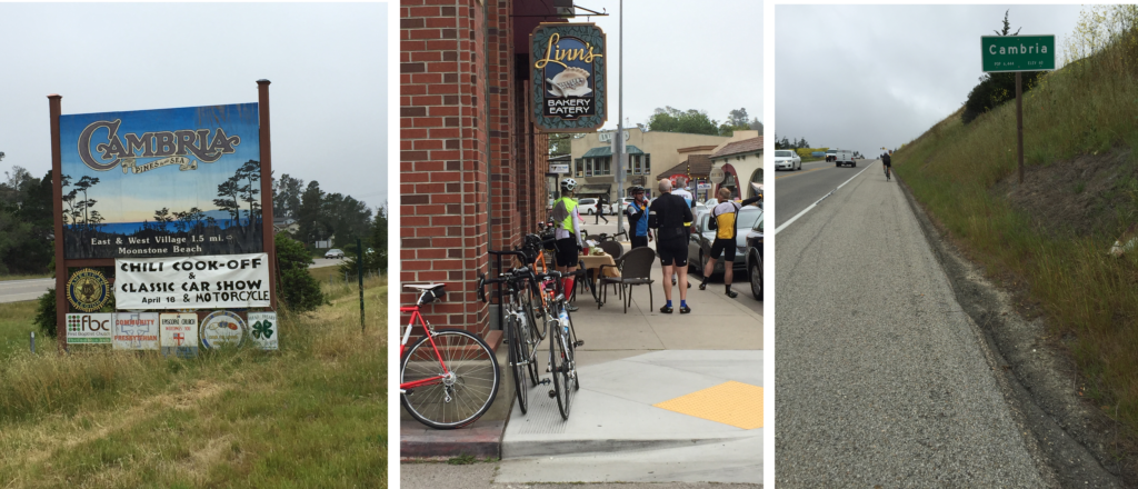 The route heads out of Paso Robles on beautiful Peachy Canyon Road before making its way over to Highway 46 (on either Vineyard Rd–Main Route or Willow Creek Rd–“Longer” Route (hint, it’s actually not longer)) for the trip out to the Pacific Coast and the town of Cambria. If it is a clear day, the summit on Highway 46 offers spectacular views south along the coast for at least 30 miles, including the Morro Bay Rock. From the summit, we’ll enjoy a 9-mile descent to Highway 1 and then turn north into the town of Cambria, where we will stop for coffee and pastry at Linn’s on the corner of Wall Street and Main Street (on your right heading into town).
